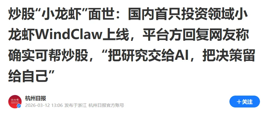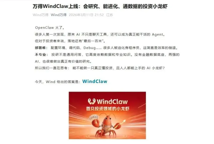 3月11日晚,金融软件服务提供商万得(Wind)宣布,WindClaw上线,是国内首只投资领域的小龙虾,已正式开启公测。