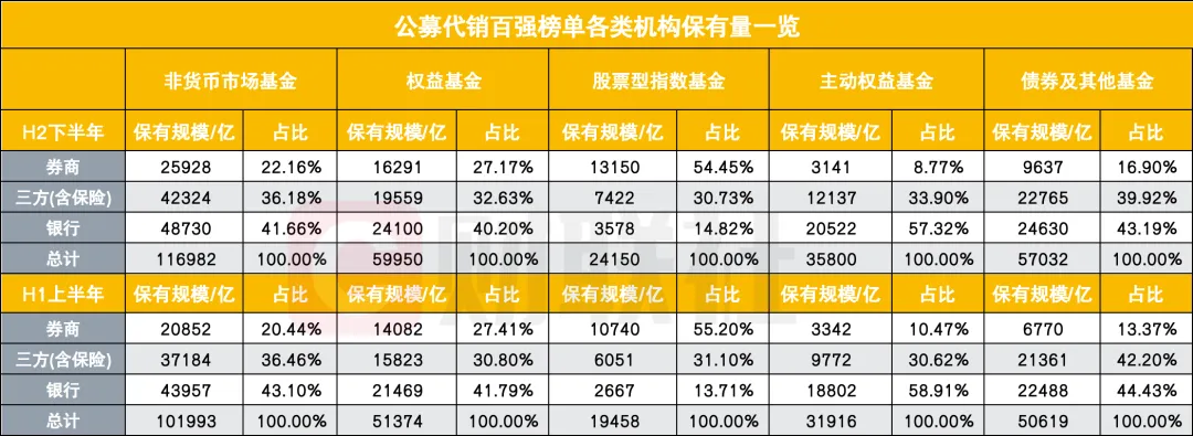 从全市场数据来看,2025年下半年公募代销规模显著扩容,同时结构也在优化。百强机构非货币市场基金保有规模合计116982亿元,较上半年的101993亿元增长14.70%;权益基金保有规模59950亿元,环比增长16.69%;股票型指数基金作为增长引擎,规模达24150亿元,环比增幅24.11%,延续了上半年的高增态势。