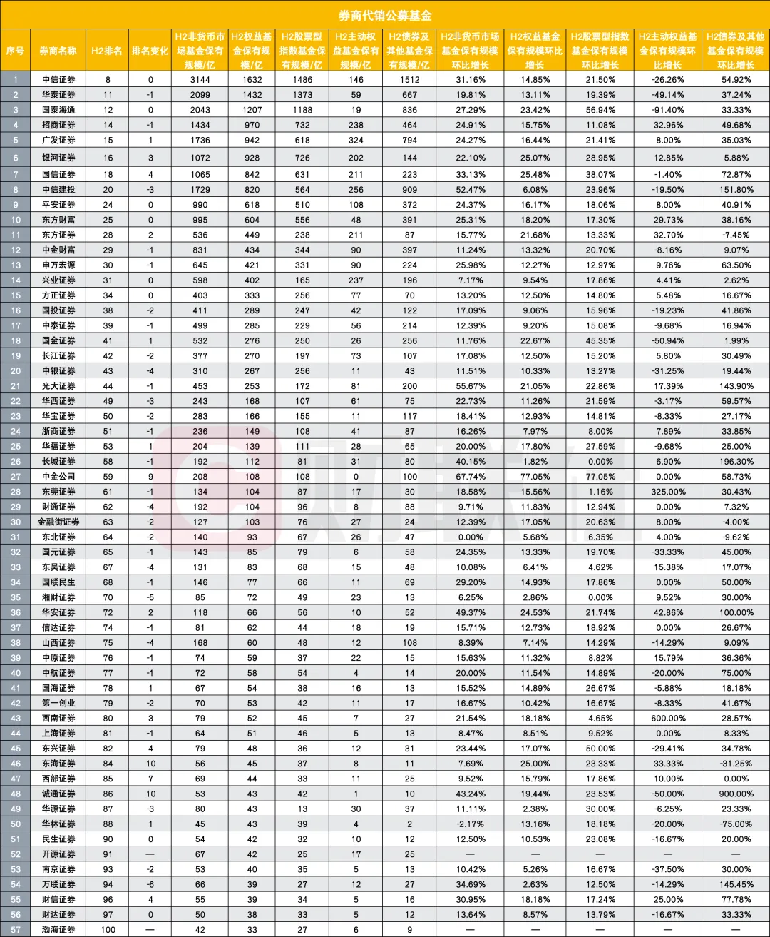非货基金方面,中信证券以 3144 亿元的保有规模稳居券商首位,较上半年增长 31.16%,增速在头部券商中表现突出;华泰证券、国泰海通紧随其后,保有规模分别达 2099 亿元、2043 亿元,环比增幅均超 20%。