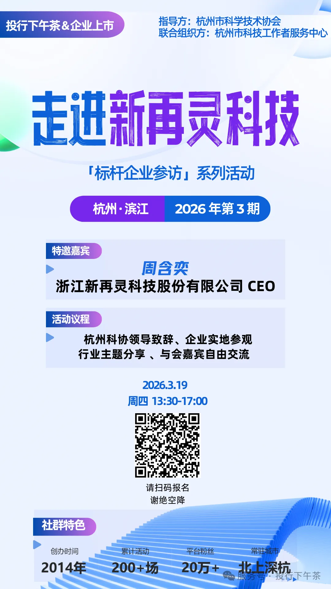 一起走进电梯安全领域的 “最强数据大脑” ——新再灵科技活动指导方:杭州市科学技术协会联合组织方:杭州市科技工作者服务中心时间:2026.3.19 周四 13:30-17:00地点:杭州 滨江区规模:20人企业方嘉宾:CEO 周含奕、副总裁 宁新涛 活动议程:13:30-14:00 签到、集合14:00-14:20 企业展厅/实验室参观14:20-14:30 杭州市科协领导致辞14:30-15:00 新再灵公司CEO/总裁 周含奕 分享 15:00-15:30 新再灵副总裁 宁新涛 分享15:30-16:30 参会嘉宾轮流自我介绍16:30-17:00 自由交流扫码报名哈,感谢