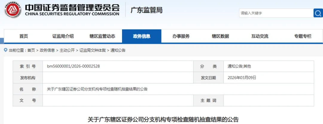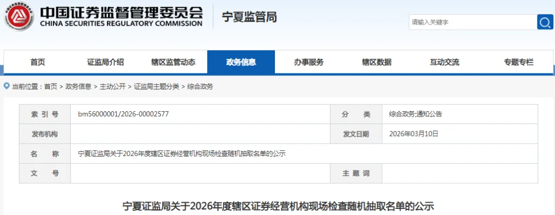 近日,我局通过机选方式抽取了2026年辖区证券经营机构现场检查对象名单。现公告如下: