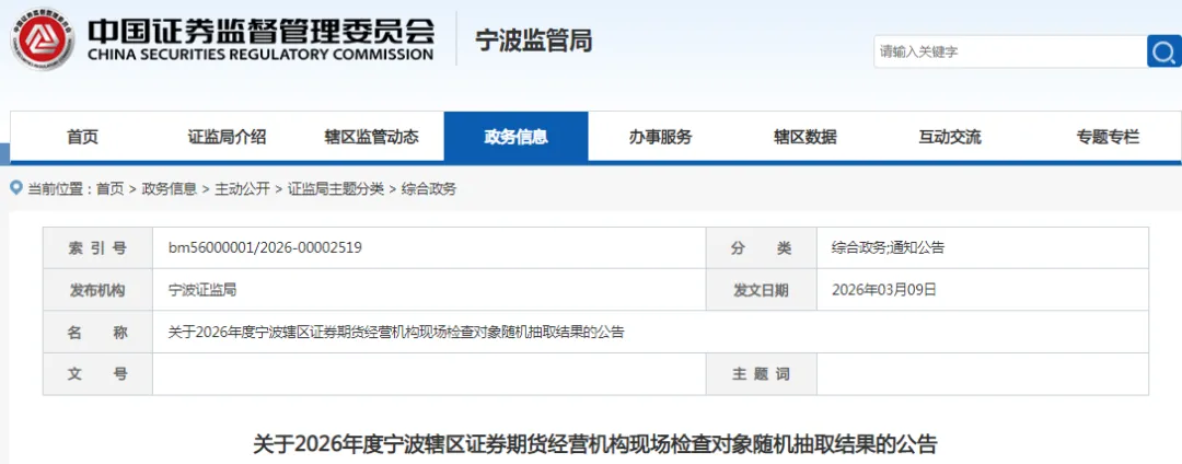 为贯彻落实国务院、证监会关于随机抽取现场检查对象工作安排及要求,我局于2026年3月5日组织开展辖区证券期货经营机构现场检查对象随机抽取工作。本次抽取使用电脑程序,局纪检办、宁波市证券期货业协会、证券期货业党风廉政业务监督员现场监督。现将抽取结果公告如下: