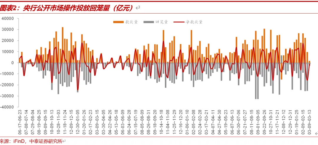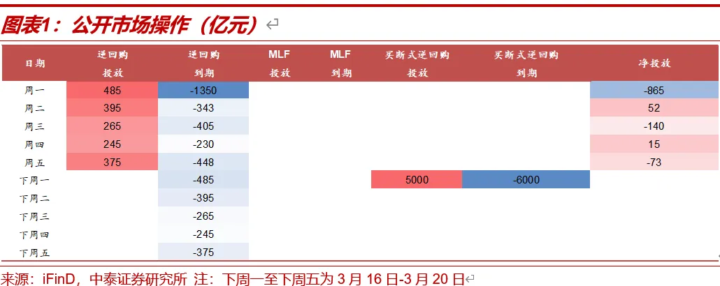 本周(3.9-3.13,下同)共有2776亿元逆回购到期。周一至周五央行分别投放逆回购485、395、265、245、375亿元,期间累计投放1765亿元逆回购;全周净回笼流动性1011亿元。下周一有5000亿元买断式逆回购投放和6000亿元买断式逆回购到期。
