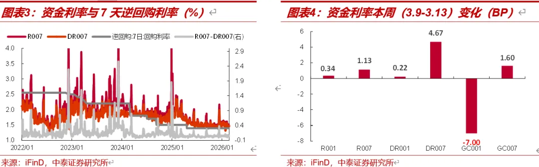 本周资金价格多数上行。截至3月13日,R001、R007、DR001、DR007分别为1.39%、1.5%、1.32%、1.46%,较3月6日分别变动0.34BP、1.13BP、0.22BP、4.67BP,分别位于1.39%、1.5%、1.32%、1.46%历史分位数。