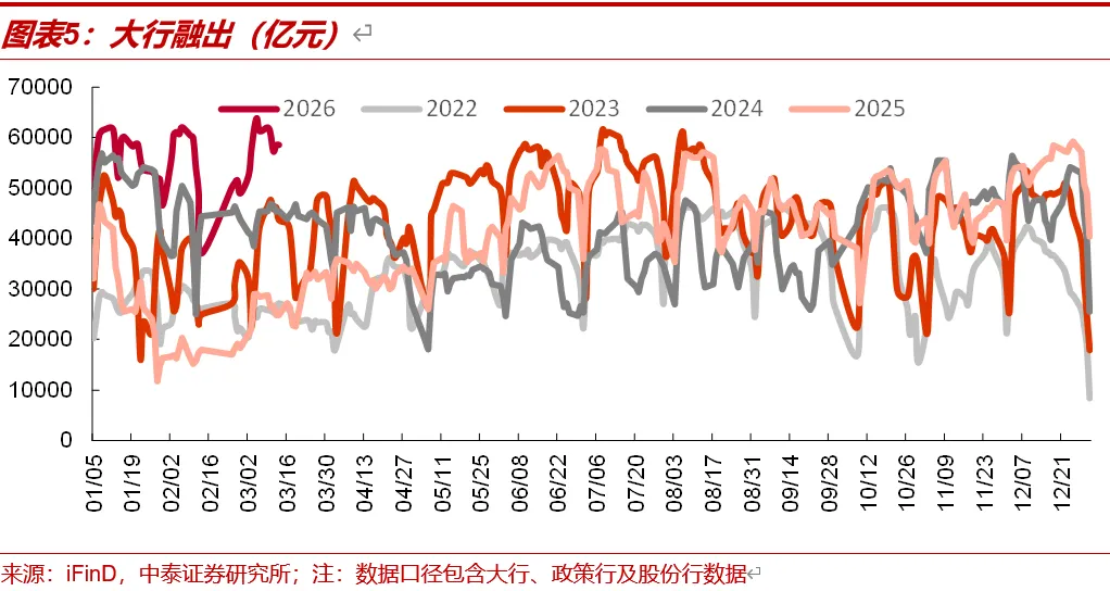 大行融出日均环比小幅下行。3月9日-3月13日大行融出规模合计29.68万亿元,单日最高融出规模6.2万亿元,日均融出规模5.9万亿元,环比前一周日均值上行0.01万亿元。