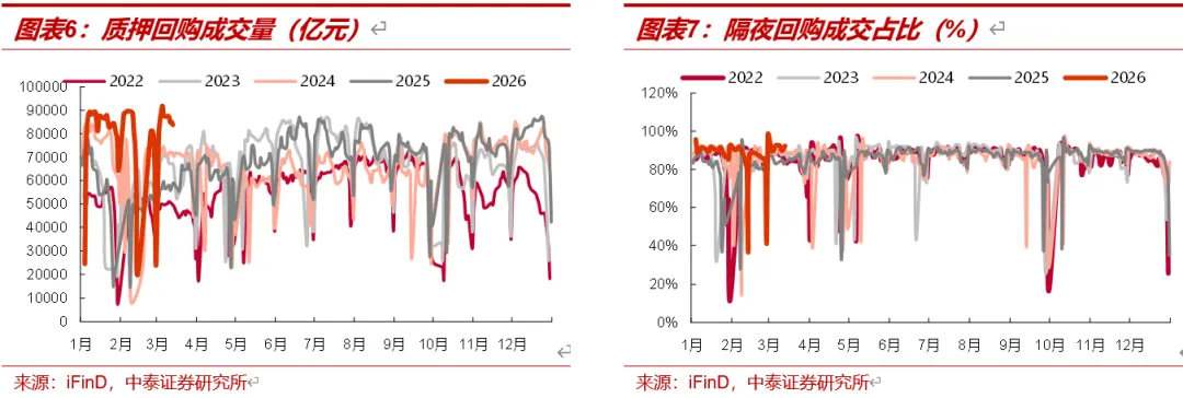 质押式回购交易量下行。日均成交量为8.57万亿元,单日最高达8.75万亿元,较上周日均值下行0.79%。隔夜回购成交占比下行。日均占比为91.1%,单日最高达92.4%,较前一周的日均值下行0.05个百分点,截至3月13日位于97.9%分位数。