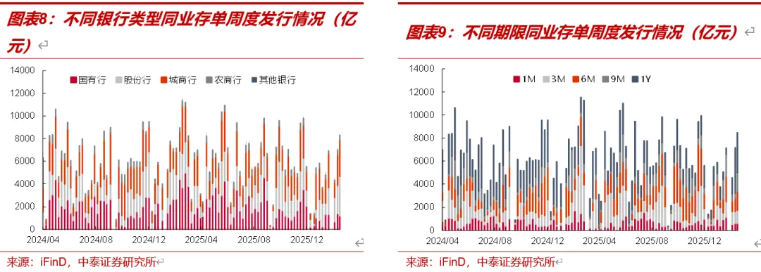 分期限类型来看1Y发行规模最高。1M、3M、6M、9M、1Y同业存单的发行规模分别为597亿元、1172.1亿元、1551.7亿元、1684.3亿元和3453.8亿元,较前一周分别变化2.9亿元、125.2亿元、454.5亿元、1211.3亿元和-499亿元。1Y存单占分类型银行存单总发行量比例最高,占比40.83%,主要是股份行发行较多;9M期限占比为19.91%,主要是城商行发行较多。