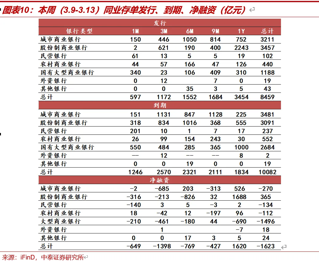 本周(3.9-3.13,下同)同业存单发行规模环比增加,净融资额为负。总发行量为8458.9亿元,较上周增加1294.9亿元;到期总量10082.0亿元,较前一周增加4202.1亿元。净融资额为-1623亿元,较上周减少2907.2亿元。