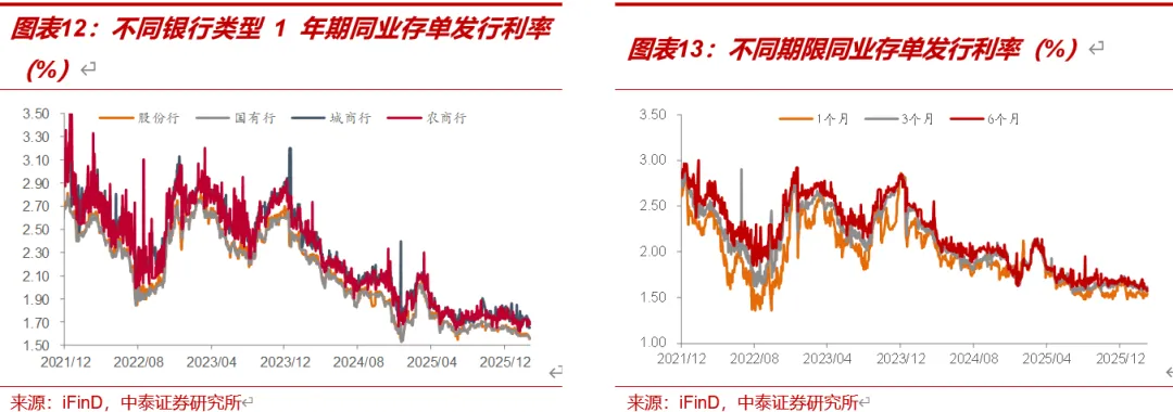 本周各银行存单发行利率多数下行,各期限存单发行利率分化。分银行类型来看,截至3月13日,股份行、国有行、城商行和农商行一年存单发行利率较3月6日环比变化0.06BP、0BP、-0.8BP、-5.95BP,位于0%、2%、0%、0%历史分位数;分期限来看,截至3月13日,1M、3M、6M存单发行利率分别较2月28日变动0.18BP、0.71BP、-2.97BP,位于5%、1%、0%历史分位数。