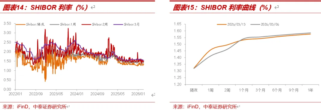 本周Shibor利率曲线多数下行。截至3月13日,隔夜、1周、2周、1M、3M Shibor利率分别较3月6日变动0.2BP、4.5BP、3.3BP、-0.87BP、-1.28BP至1.32%、1.46%、1.5%、1.53%、1.54%。