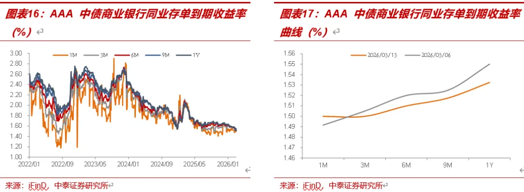 本周存单到期收益率多数下行。截至3月13日,评级为AAA的中债商业银行同业存单1M、3M、6M、9M、1Y到期收益率分别为1.5%、1.5%、1.51%、1.52%、1.53%,较3月6日分别变动0.84BP、-0.5BP、-1BP、-0.75BP、-1.75BP。