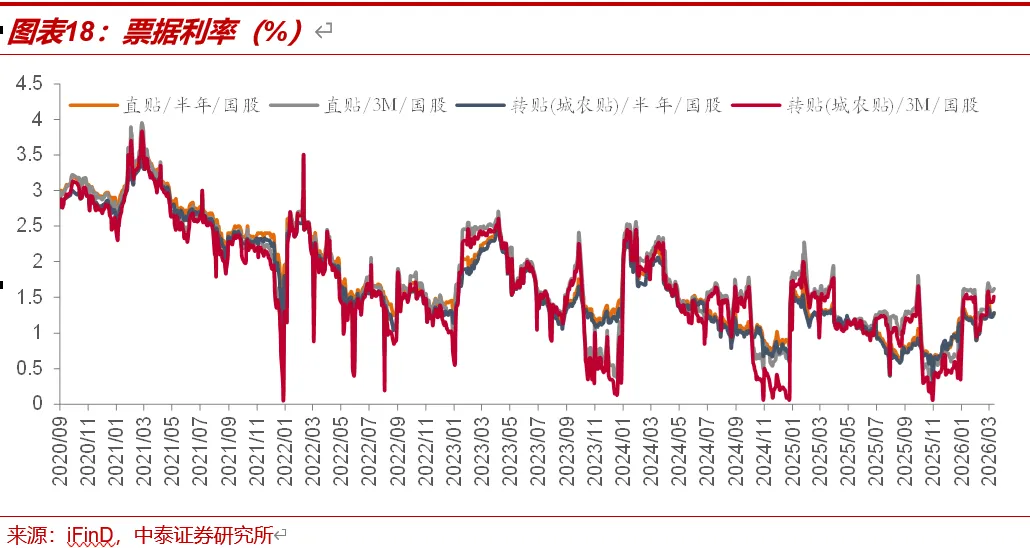 本周票据利率多数上行。截至3月13日,3M期国股直贴利率、3M期国股转贴利率、6M期国股直贴利率、6M期国股转贴利率分别为1.62%、1.53%、1.26%、1.28%,较3月6日分别变动4BP、10BP、0BP、6BP。
