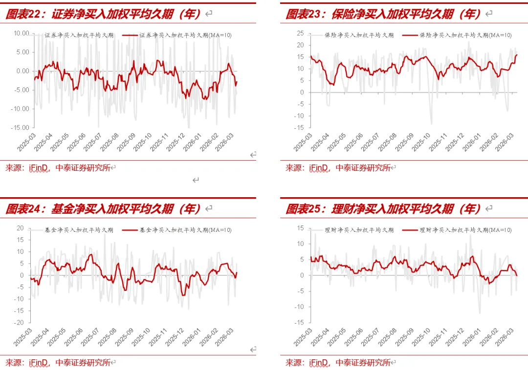 基金净买入久期小幅回升,保险继续加久期。截至3月13日,基金净买入加权平均久期(MA=10)为1.23年,较3月6日的1.00年下降,位于38%的历史分位数水平;理财净买入加权平均久期(MA=10)为-0.07年,较3月6日表现下降,位于38%的历史分位数水平;证券净买入加权平均久期(MA=10)为-2.76年,较3月6日表现下降,位于25%的历史分位数水平;保险净买入加权平均久期(MA=10)为15.98年,较3月6日表现上升,位于100%历史分位数水平。