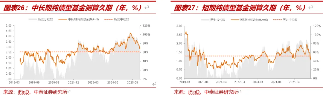 中长期纯债基金久期环比回升。截至3月13日,中长期纯债型基金较3月6日回升0.27年至3.02年,位于2025年以来10%历史分位数水平;短期纯债型基金较3月6日回升0.21年至1.31年,位于2025年以来16%历史分位数水平。