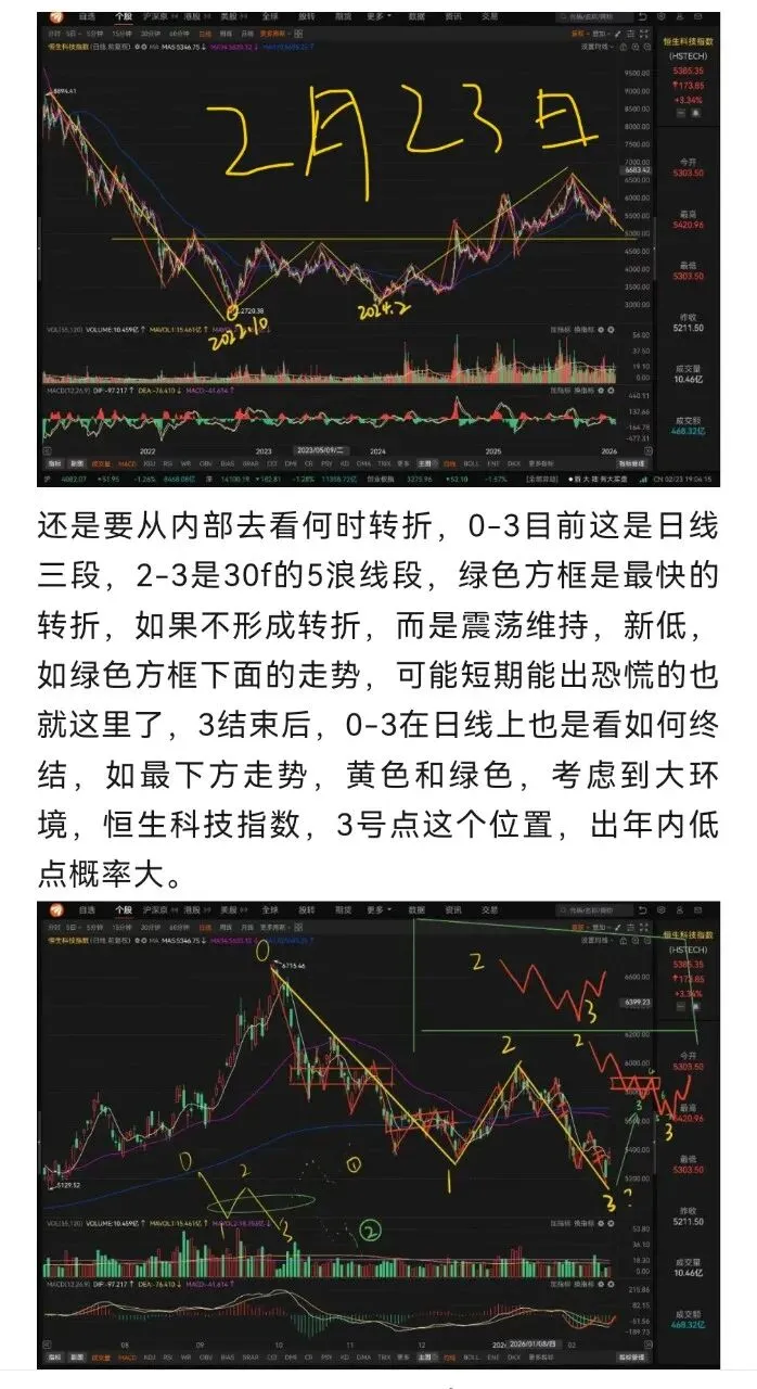 【电力,券商,恒生指数走势更新】2026.3.17午评指数虽然内部还不能确认,但相较于前一段背驰概率大,这是震荡中纯粹的同级别比较而言。储能电池内部重叠出上涨中枢预期电力1f上涨中枢构筑后面macd背驰时候不一定新低,因为空间先到位。大级别优势可能比1f更重要。怎么转折的问题只是怎么转折的问题。周线需要像恒生科技一样有底分型。恒科2月底分析:恒科当下空间到位,周线底分型。