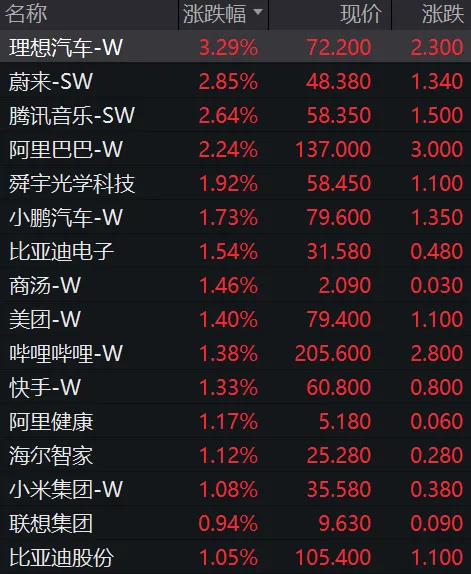 科网股集体走高,理想汽车涨超3%,腾讯音乐、蔚来涨超2%,小米集团、美团、商汤、腾讯控股、京东集团等涨超1%。