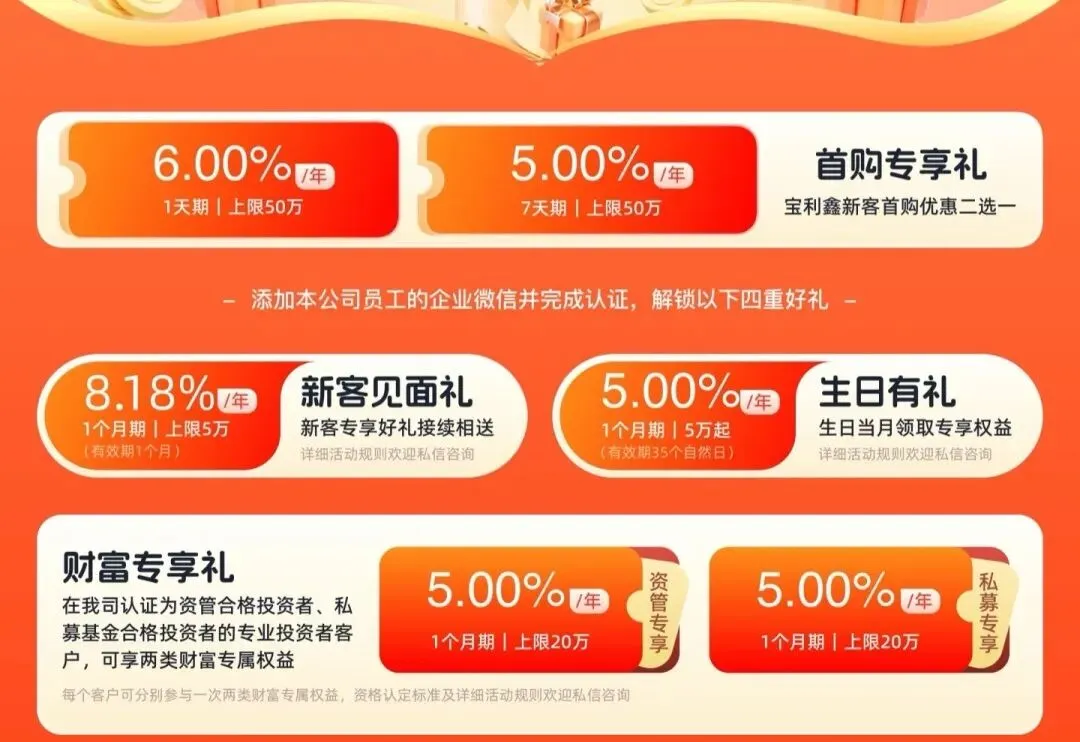 新客理财年利率通常在4% - 9%之间 ,远超银行活期利率,比大部分定期存款利率还高。举个例子,你有2万元闲置资金,银行活期年化利率按0.3%算,存30天收益才5元;但要是买年化收益率6%的30天新客理财产品,到期收益能有100元,而且还有经理自备的红包福利,差距一目了然,这不就是白捡的零花钱嘛!