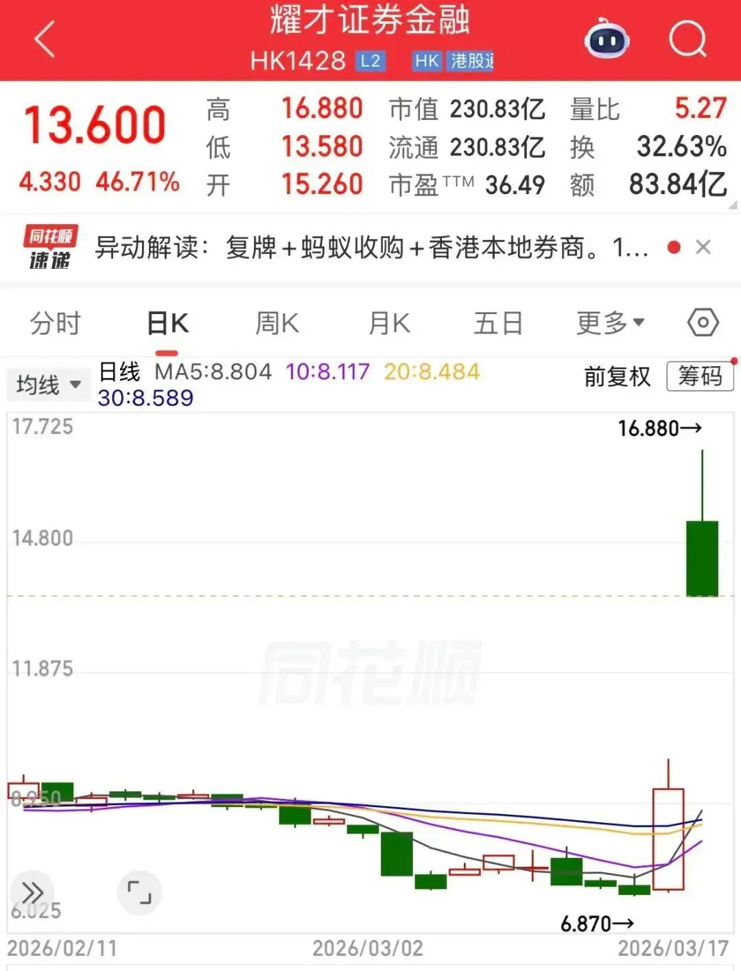 值得注意的是,3月13日(公告前两日),耀才证券股价已提前异动,单日放量大涨33.96%,成交额激增至近25亿港元,显示市场资金或已提前获知消息。