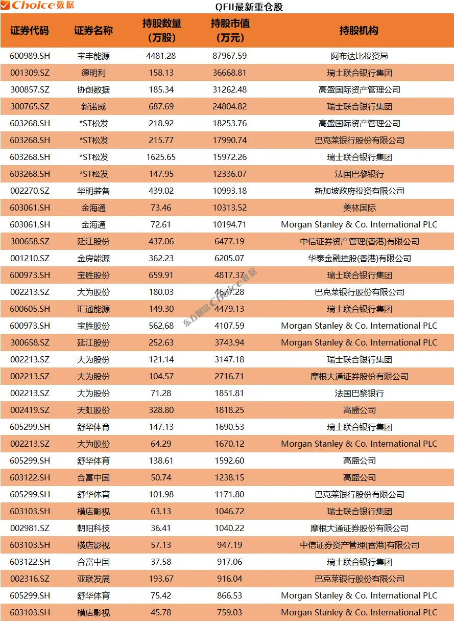 具体来看,阿布达比投资局持有宝丰能源4481.28万股,持有市值高达8.8亿元;瑞士联合银行持有德明利158.13万股,市值3.67亿元,还持有新诺威、宝胜股份、汇通能源等;巴克莱银行、Morgan Stanley & Co. International PLC均持有大为股份、舒华体育。