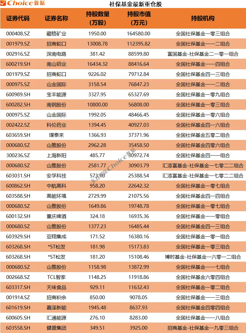 其中,全国社保基金一一二组合、四一三组合合计持有招商蛇口2.22亿股,持股市值19.21亿元;全国社保基金一零六组合、一一二组合合计持有山金国际5150.58万股,持股市值12.53亿元;全国社保基金一零三组合、一一四组合分别持有藏格矿业、南山铝业16.46亿元、8.84亿元。