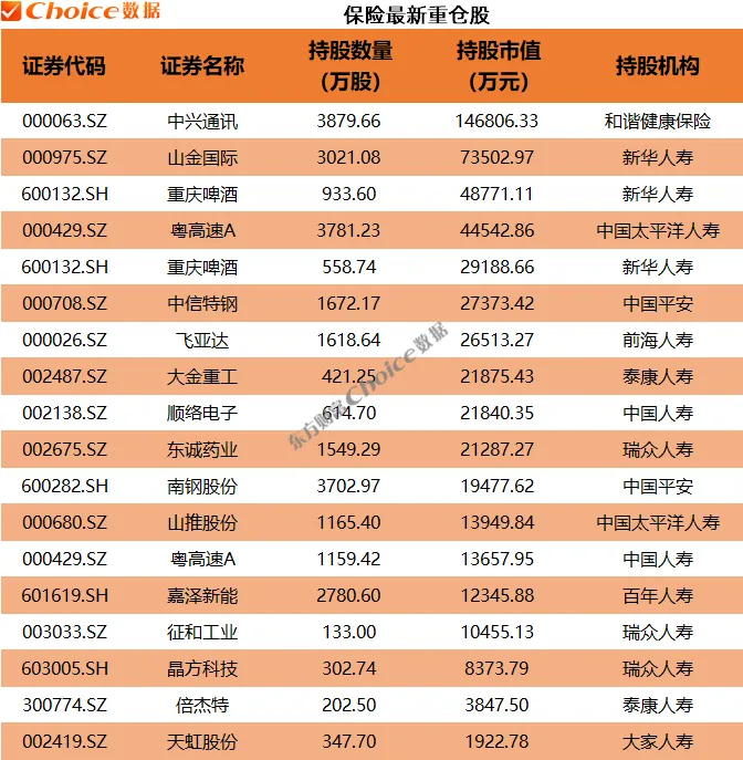 保险公司持股方面,在已公布2025年年报的上市公司中,和谐健康保险持有中兴通讯3879.66万股,持股市值14.68亿元;新华人寿持有山金国际、重庆啤酒,持股市值7.35亿元、7.8亿元;中国太平洋人寿、中国平安持有粤高速A、中信特钢市值均超过2亿元。