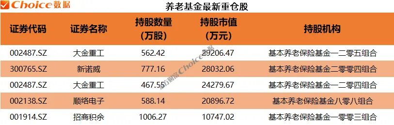 养老基金持股市值最高的是大金重工,养老金一二零五组合、一二零四组合合计持有1029.97万股,持股市值5.35亿元;其次是新诺威,二零零四组合持有777.16万股,持股市值2.8亿元。