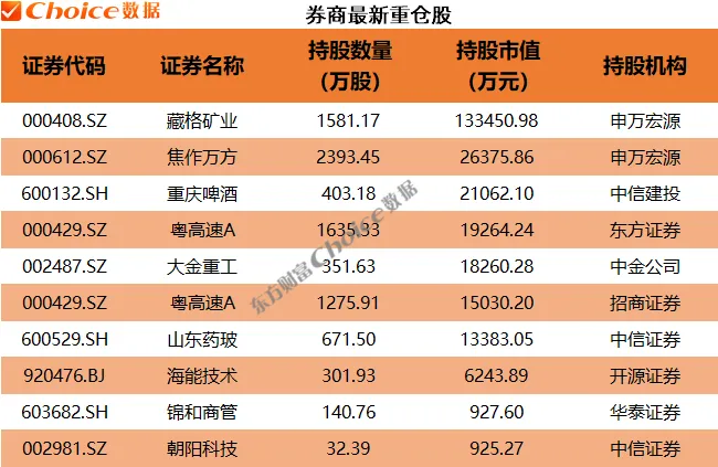 申万宏源持有藏格矿业、焦作万方1581.17万股、2393.45万股,持股市值13.35亿元、2.64亿元;中信建投、东方证券、中金公司、招商证券、中信证券分别持有重庆啤酒、粤高速A、大金重工、粤高速A、山东药玻,市值均超亿元。