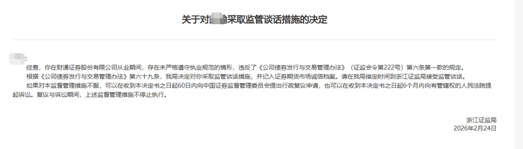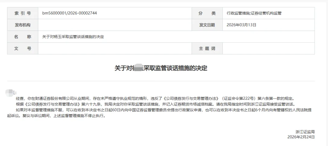 不是罚机构,而是直接点名到人,而且处罚方式不是警告、不是罚款,是“监管谈话+记入诚信档案”。这种处罚还是比较少。