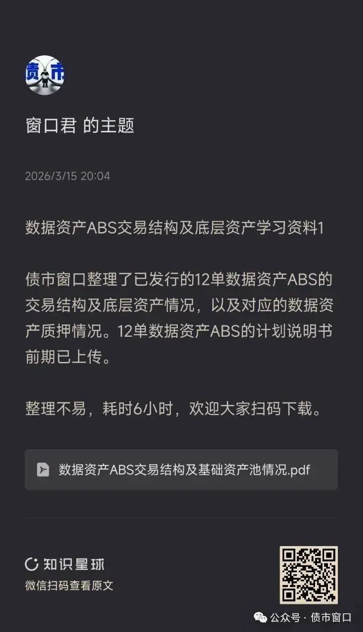 1、债市窗口总结了当下最火热的数据资产ABS的交易结构和资产池情况,可扫码下载查看。