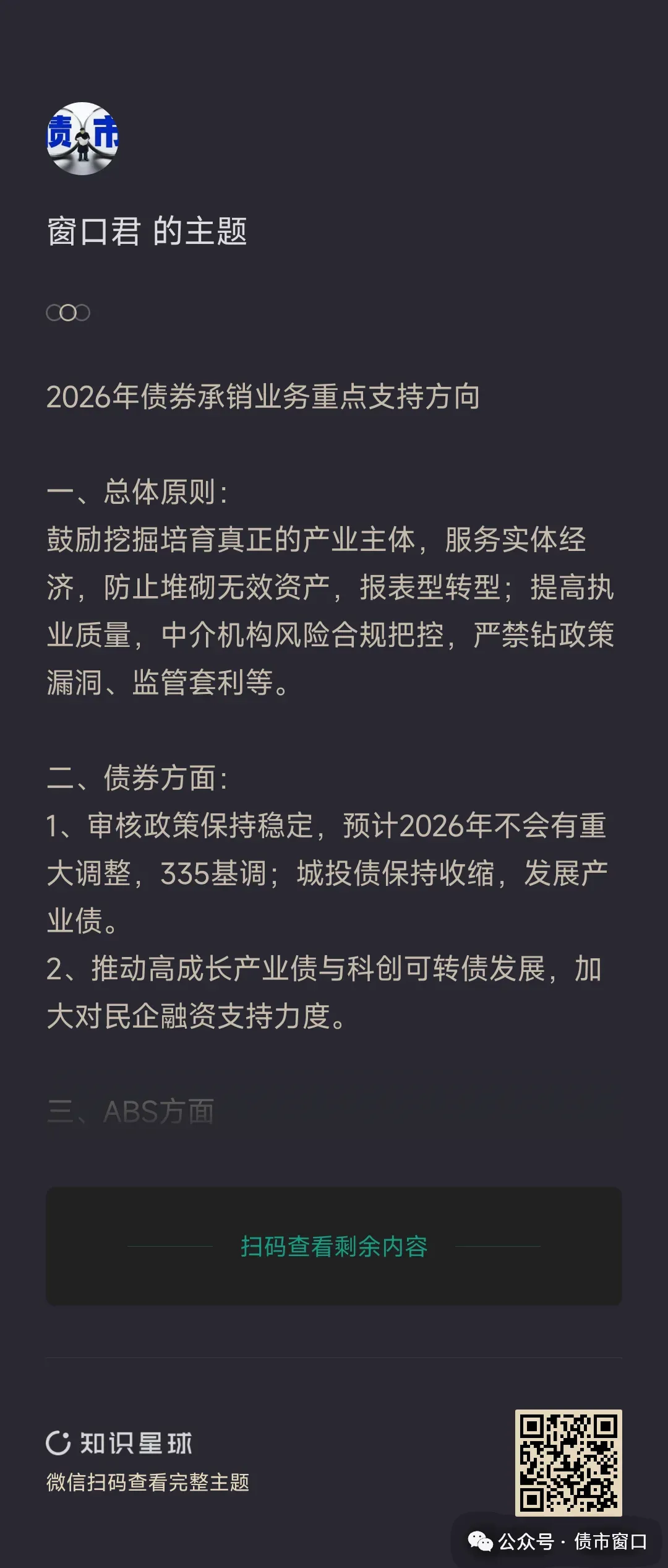 债市窗口知识星球上传了:335指标测算参考、产投资产整合建议书模板、CMBS参考资料模板、去核心供应链ABS案例集合和方案模板、收费收益权ABS案例汇总等干货,欢迎扫码加入。