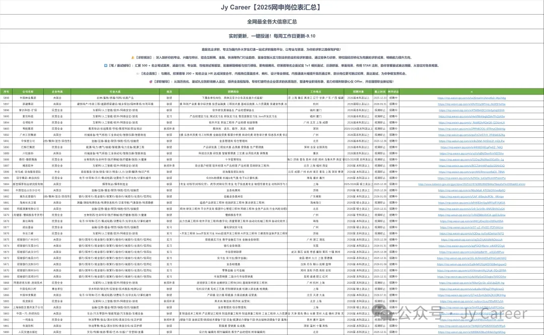 此表格包含了当前的秋招+秋招补录+来年的春招信息 工作日更新! 包括国央企、事业单位、私企、外企、合资企业,全行业类型! 涵盖互联网/金融/科技/制造业/咨询/快消/医药/地产/教育/文娱等行业 建议同学们提前做好准备,以免错失良机。
