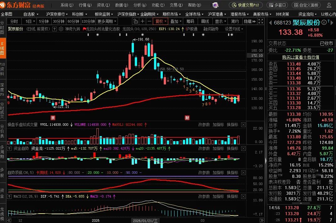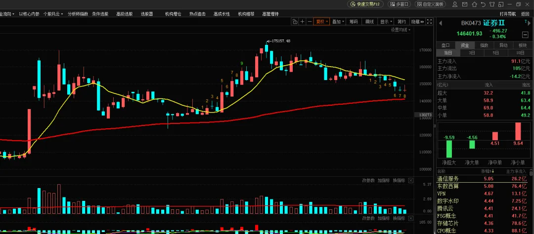 原油价格这么涨下去,全球央行都得要考虑加息抑制通胀了。券商板块已经连续调整29周,回调幅度14.34%。本周周线九转低8,下周就是低9了。券商这轮调整应该基本见底了。但是市场牛市预期已经快速下降。成交量萎缩到2万亿左右了。如果配合4月份美以伊战争缓和合懂王访华消息,可能券商有一波小反弹吧。如果券商调整到位了,那么互联网金融也就到位了。互联网金融几个标的纳入观察:东方财富,同花顺,指南针,财富趋势,大智慧。其中同花顺走势最符合我的审美,且周二那根阳线放量最漂亮,重点关注。这轮牛市我在互联网金融的几个票里都赚了钱。希望这次不让我失望。科创板的半导体股聚辰股份走势比较符合战法,放量反弹,两阳夹一阴,纳入观察。战法的本意是选择走长期趋势的牛股,在回调到位后建仓等待新一轮的拉升。现在市场处于震荡结构中,战法的胜率和赔率都不足以让我重仓满仓。