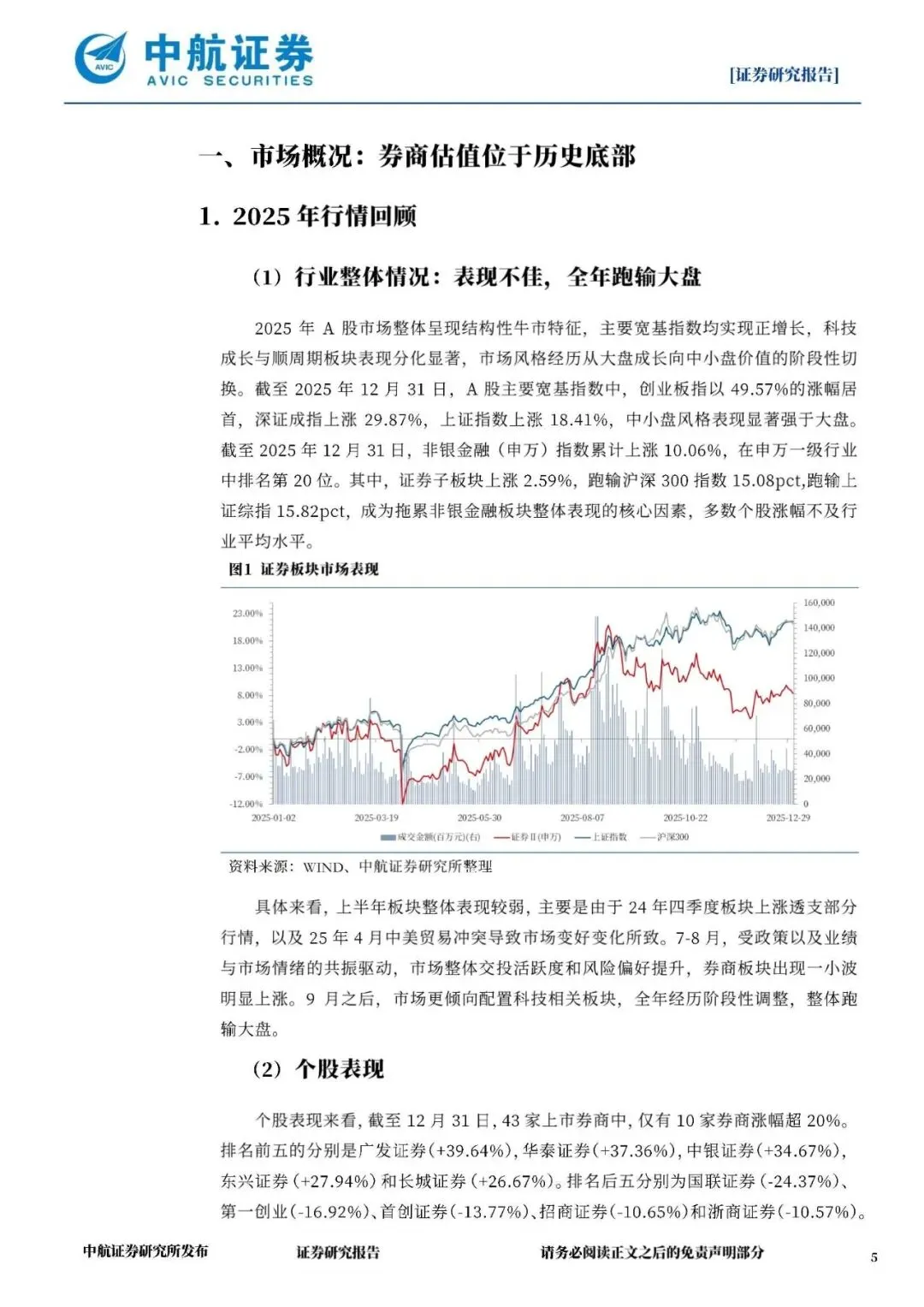 2025年A股市场整体呈现结构性牛市特征,主要宽基指数均实现正赠长,科技成长与顺周期板块表现分化显著,市场风格经历从大盘成长向中小盘价值的阶段性切换。截至2025年12月31日,A股主要宽基指数中,创业板指以49.57%的涨幅居首,深证成指上涨29.87%,上证指数上涨18.41%,中小盘风格表现显著强于大盘。截至2025年12月31日,非银金融(申(万)指数累计上涨10.06%,在申万一级行业中排名第20位。