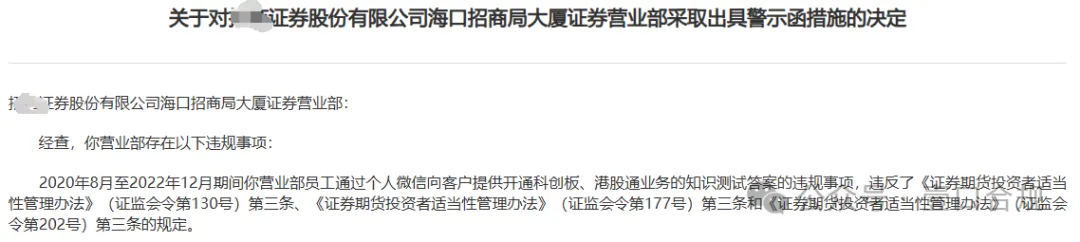 某头部券商营业部被罚,所谓何事?对应的合规提醒!| 案例2024年第202期处罚一个,警示一批。本文的目的亦在于借助个案起到警示教育的目的,同样希望各位读者立足于此,更多关注案例背后暴露出的合规问题。以案促改,以案促进,共同助力证券从业人员的执业能力提升和证券行业的健康高质量发展。2024年12月9日,海南证监局发布处罚决定,对某头部证券公司海口招商局大厦证券营业部采取出具警示函的行政监管措施。通过个人微信向客户发送测试答案,且持续三年!当事人:ZS证券公司海口招商局大厦证券营业部罚单披露,该营业部存在以下违规事项:2020年8月至2022年12月期间,营业部员工通过个人微信向客户提供开通科创板、港股通业务的知识测试答案的违规事项,违反了《证券期货投资者适当性管理办法》(证监会令第130号)第三条、《证券期货投资者适当性管理办法》(证监会令第177号)第三条和《证券期货投资者适当性管理办法》(证监会令第202号)第三条的规定。依规,监管部门对该分公司进行了处罚!类似处罚此前已发生多起应加强此类违规行为的管控!近年来,类似的处罚还是比较常见的。一些分支机构和从业人员基于业绩达标等原因,通过泄露试题、传递答案、协助答题等方式,“帮助”客户在风险测评、知识测试环节“达标”。殊不知,这样的违规操作所留下的隐患是非常之大的。当投资者在该类业务下出现亏损,极易引发纠纷和投诉。从实务角度看,设置这些测试,既是保护投资者,也是保护证券经营机构及其从业人员。遵照监管规则,把规定动作做到位,才能把“卖者有责”的职责履行到位,进而实现“买者自负”。因此,聪明的机构和从业人员肯定不是天天琢磨着怎么违规不被发现,恰恰相反,他们往往是学法、守法、遵法的标杆和榜样!话不多说,还是案例警示吧!2024年,因在风险测评、知识测试环节为客户提供便利被处罚的案例一共有 起,9张人员罚单和7张机构罚单。具体处罚案例梳理如下:一、机构罚单1.2024年12月,海南局对某证券分支机构出具警示函,因其存在:2021年10月至2024年7月,分公司员工通过个人微信向客户提供开通科创板、北交所合格投资者登记的知识测试答案的违规事项。2.2024年8月,甘肃局对某证券营业部出具警示函,因其存在:个别从业人员向客户提供开通融资融券、科创板业务的知识测试答案等行为。3.2024年8月,浙江局对某证券分支机构出具警示函,因其存在:部分员工屡次向客户提供开户知识测评或风险测评答案,提示客户提高风险承受等级的行为。4.2024年7月,山东辖区某证券营业部被出具警示函,因其存在:员工使用其本人微信向投资者发送开通新三板挂牌公司股票交易权限知识测试答案的情形。5.2024年6月,山东局对某证券公司出具警示函,因公司存在:个别员工存在通过个人微信向客户发送融资融券业务资质评估问卷答案、创业板权限知识测试答案和科创板权限知识测试答案等行为。6.2024年3月,宁夏辖区某证券营业部被出具警示函,因其存在:营业部从业人员在从事证券经纪业务营销活动期间,存在向投资者提供风险测评答案等问题。7.2024年2月,山东辖区某证券营业部被出具警示函,因其存在:个别员工向客户提供风险测评重点问题答案和融资融券业务知识测试答案等问题。二、人员罚单1.2024年8月,甘肃局对某证券营业部投资顾问简某明出具警示函,因其向客户提供开通融资融券、科创板业务知识测试答案等情形。2.2024年8月,浙江局对某证券分支机构员工万某波责令改正,因其屡次向客户提供开户知识测评或风险测评答案,提示客户提高风险承受等级。3.2024年8月,青岛局对某证券营业部经纪人袁某出具警示函,因其存在向客户发送风险测评重点问题答案、新开户自助回访答案等情形。4.2024年6月,山东局对某证券营业部员工魏某出具警示函,因其通过个人微信向客户发送融资融券业务资质评估问卷答案、创业板权限知识测试答案和科创板权限知识测试答案。5.2024年6月,河南局对某证券营业部员工王某宇出具警示函,因其在客户风险测评过程中进行不当提示等行为。6.2024年4月,河南辖区某证券营业部员工赵某玉被出具警示函,因其从业期间存在不当协助客户进行风险测评,为开通科创板和北交所交易权限的客户代为作答知识测试行为。7.2024年3月,宁夏辖区某证券营业部工作人员王某皓被出具警示函,因其从业期间存在向投资者提供风险测评答案等问题。8.2024年2月,山东辖区某证券营业部工作人员崔某被出具警示函,因其从业期间存在向客户提供融资融券业务知识测试答案的情形。9.2024年2月,山东辖区某证券营业部工作人员姜某被出具警示函,因其从业期间存在向客户提供风险测评重点问题答案和融资融券业务知识测试答案的情形。免责声明:本文系个人整理,如有出入,请咨询专业机构并查询相关法律法规及监管部门意见,本人不承担任何责任。关注公众号可了解更多案例分析和规则解读!获取2020-2025年处罚材料、商务合作、信息共享、入群、投稿、转载可扫码添加作者!知识星球《壹口合规》已正式开通,加入后可获取海量资料: