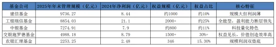两家公司均呈现“固收强、权益弱”特征,但程度不同。截至2025年末,长城基金公募总规模中,债券型基金占比达71.89%,股票型基金仅占7.54%,混合型和股票型基金合计规模约310亿元;农银汇理基金固收类基金(债券型+货币型)规模1907.68亿元,占比高达84.37%,权益类基金规模仅346.4亿元,占比15.32%。