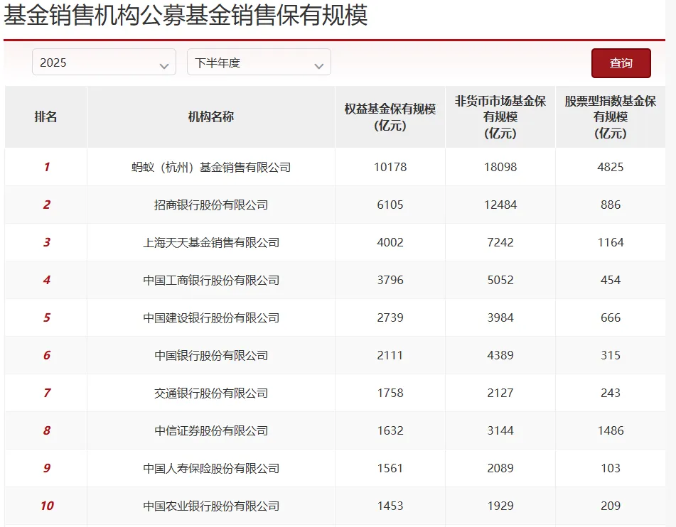 最新一期公募基金销售保有规模百强榜单出炉,行业呈现银行、券商、第三方机构各具特色的格局。蚂蚁基金依旧占据绝对优势;招商银行稳居银行渠道标杆;券商则在股票型指数基金代销上更为“卖力”。