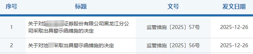 2025年12月,黑龙江证监局发布处罚决定,对某头部券商分支机构出具警示函,对该分支机构负责人池某出具警示函。