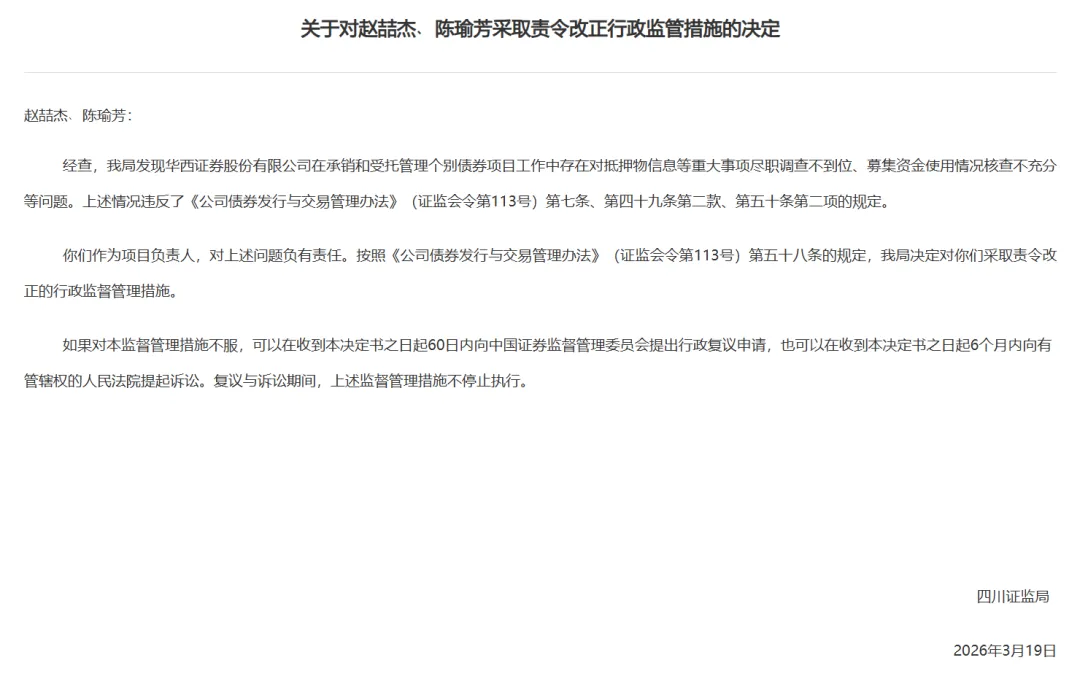 3月20日,四川证监局公布了对华西证券及其两名项目负责人的行政监管措施。