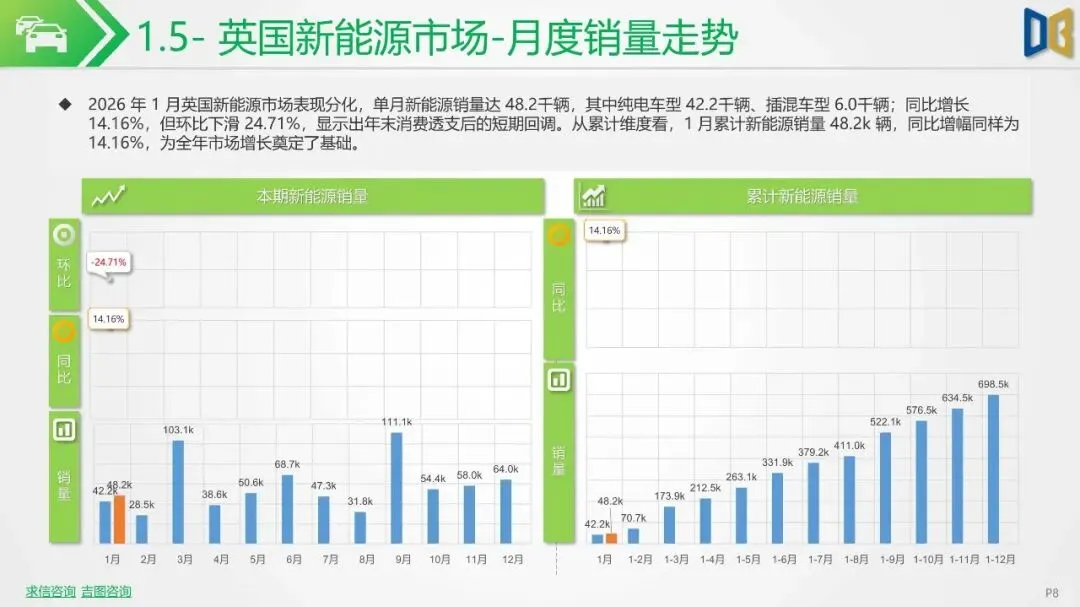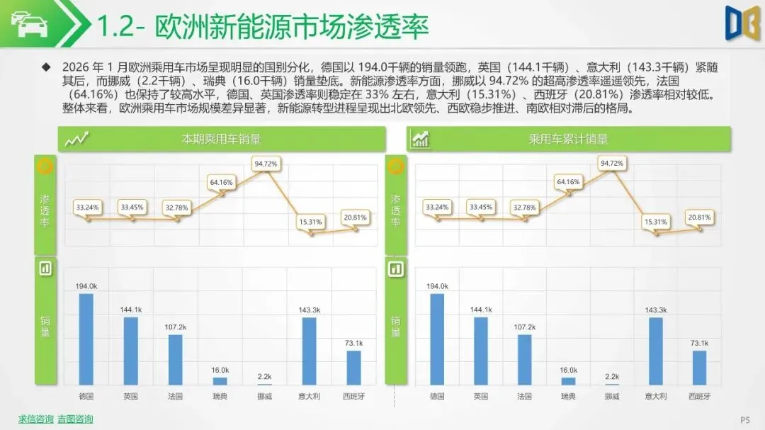 2026 年 1 月欧洲新能源市场呈现出国别分化明显、整体短期承压的态势。从单月销量看,德国以 64.5k 辆领跑,英国、法国紧随其后,挪威仅 2.1k 辆垫底;同比维度,意大利(+87.93%)、西班牙(+48.35%)、法国(+41.79%)增幅显著,挪威则同比大跌76.78%;环比维度,除意大利微降 1.42% 外,其余六国均出现两位数以上下滑,挪威环比暴跌 93.93%。
