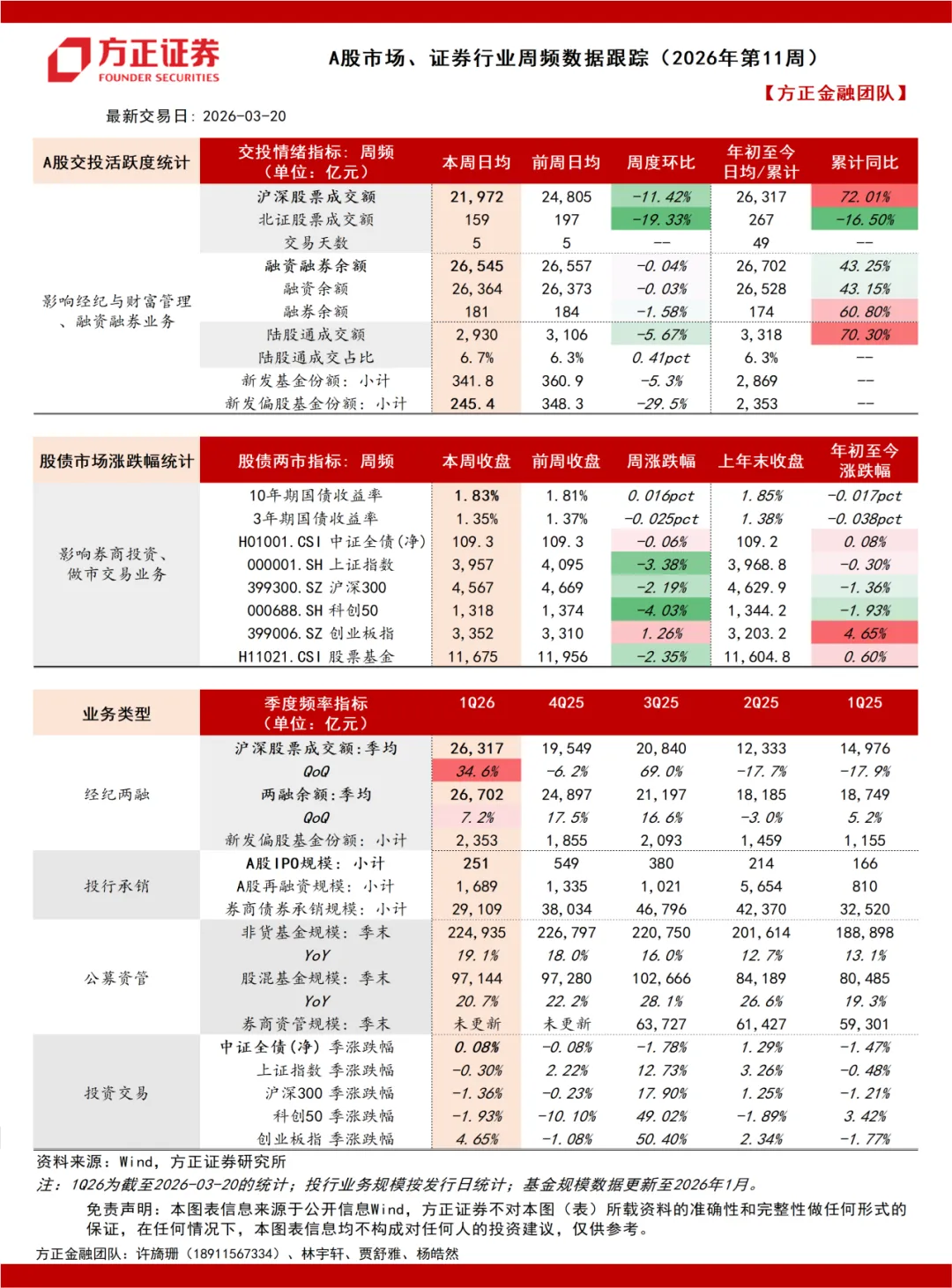 A股市场、证券行业周频数据跟踪(2026年第11周):