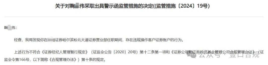 头部券商员工:仅因操作客户账户,被罚.年内类似罚单汇总 | 案例2024年第188期处罚一个,警示一批。本文的目的亦在于借助个案起到警示教育的目的,同样希望各位读者立足于此,更多关注案例背后暴露出的合规问题。以案促改,以案促进,共同助力证券从业人员的执业能力提升和证券行业的健康高质量发展。2024年11月20日,黑龙江证监局发布处罚决定,对证券营业部员工鞠某伟出具警示函。仅因操作客户账户被罚当事人:鞠某伟,HT证券公司哈尔滨松北大道证券营业部任职。罚单披露,当事人任职期间,存在违规操作客户证券账户的行为。上述行为不符合《证券经纪人管理暂行规定》(证监会公告〔2020〕20号)第十二条第一项和《证券公司和证券投资基金管理公司合规管理办法》(证监会令第166号,以下简称《合规管理办法》)第十条的规定。依规,监管部门对当事人及其所在分支机构进行了处罚。操作账户极易引起“双罚”今年已有15名从业人员和4家分支机构因此被罚在从业人员操作客户账户违规行为预防与管控上,机构应该担起主体责任,采取一些更加有力的手段和措施用于预防和监控:事前预防上。机构应加大操作账户的宣传教育力度,尤其是警示教育,以案促防,打消员工在这方面的侥幸心理。特别值得注意的是,面对经纪业务竞争白热化、内卷严重的当下,怎么做好客户服务都为不过,但前提是必须合规!因此,要把握好适度服务的度,在服务客户的内部要求、工作考核方面作出合适安排。事中监督上。机构要着力健全操作账户违规行为的事中监控手段和措施,比如在交易场所监控、异常交易监控、客户回访、无线网络监控等环节增加操作账户异常情况的监测与监控。最为核心的,是要将这些监控手段和措施,广而告之的告知机构内的每位员工,让其清醒的意识到自己的行为处于监控范围之内。做好上述工作既是保护员工个人,也是保护机构自己避免“双罚”。年内以后多家分支机构和多名从业人员因此被罚一、4家分支机构被罚机构应重视对员工行为的规范,操作客户证券账户不仅个人违规,而且还有可能连累所在分支机构一并受罚,年内有3家分支机构因此被问责:1.2024年10月,浙江局对某证券营业部责令改正,因其存在:部分员工使用直系亲属账户替客户办理证券认购、交易的行为。2.2024年8月,甘肃局对某证券营业部出具警示函,因其存在:个别从业人员替客户办理证券交易等问题。3.2024年7月,内蒙古局对某证券营业部出具警示函,因其存在:营业部原客户经理刘某春操作他人证券账户等问题。4.2024年2月,广东局对某证券分支机构责令改正,因其存在:个别从业人员违规登录与操作客户账户等问题。二、15名从业人员被罚操作账户是分支机构易发的违规行为,年内因涉及违规操作账户被处罚的案例共有9起,涉及15名从业人员:1.2024年10月,浙江局对某证券营业部管某琳出具警示函,因其2017年1月至2019年12月期间存在替客户办理证券认购、交易的行为。2.2024年10月,河南局对3名证券从业人员陈某昕、刘某平、贾某龙出具警示函,因他们曾存在操作他人证券账户行为。3.2024年9月,吉林局对某证券营业部员工李某羲出具警示函,因其存在违规操作客户证券账户的行为。4.2024年8月,甘肃局对某证券营业部投资顾问简某明出具警示函,因其存在替客户办理证券交易等问题。5.2024年7月,内蒙古局对某证券营业部客户经理刘某春出具警示函,因其存在操作他人证券账户等问题。6.2024年6月,广东局对某证券营业部员工谢某旺出具警示函,因其存在登录与操作客户证券账户等问题。7.【仅此一项违规】2024年4月,北京局对某证券营业部经纪人刘某蛟出具警示函,因其存在替客户办理账户开立的情况。8.【仅此一项违规】2024年2月,深圳局对某证券公司刘某波、郭某子、孟某、徐某婧、陈某宁等5人出具警示函,因他们在2017年9月前曾存在操作他人证券账户的行为。9.【仅此一项违规】2024年2月,广东局对某证券营业部员工黄某锋出具警示函,因其存在登录与操作客户账户的行为。免责声明:本文系个人整理,如有出入,请咨询专业机构并查询相关法律法规及监管部门意见,本人不承担任何责任。关注公众号可了解更多案例分析和规则解读!获取2020-2025年处罚材料、商务合作、信息共享、入群、投稿、转载可扫码添加作者!知识星球《壹口合规》已正式开通,加入后可获取海量资料: