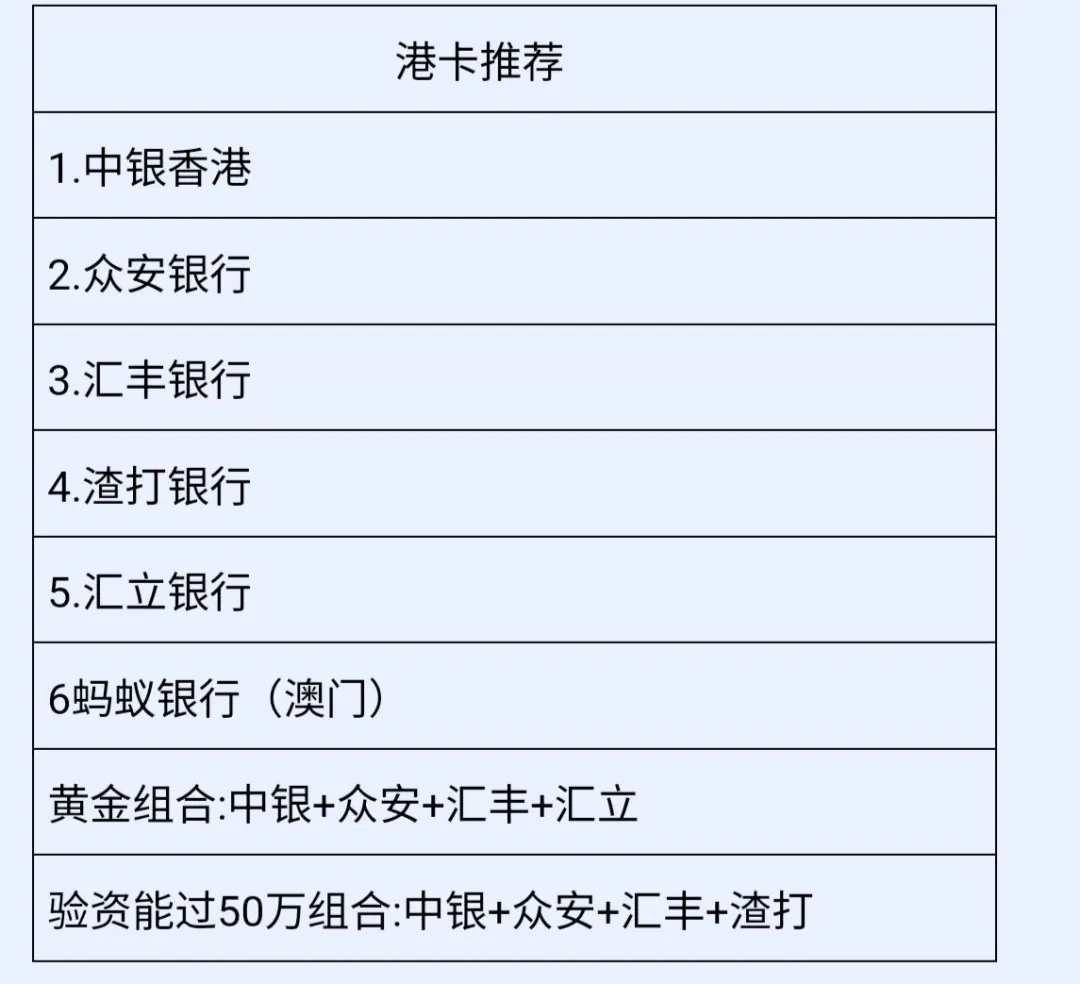 2026赴港开港卡+港美券商详细攻略我们提供免费办公室,WIFI,专业人员指导你们线上开港卡和港美券商汇丰5-15天(密函1-3个月) 众安5-15天 中银1-3个月注意:姓名大众化和两个字的线上不容易通过,有资料就尽量线下我们带你过境协助你线上和线下办理+后期指导使用跨境汇款等注:套1-套2 保底成功2张。 套3-套4 保底成功3张注意:以上资料全部打印一份,有电子版的都要保留一份在邮箱可能会现场发给工作人员1、国内本人资产50万验资(几张卡里,劵商里面都可以)如果特殊原因不能到港,也可以内地见证开户汇丰和渣打银行1.问:开户目的 参考:投资理财买港美股(你要有炒股经验才这样回答。你要先去了解近期火热的股票和它的股价)~有购买分红险的直接说购买港险就行2.问:准备投资多少钱 参考:根据你真实资金回答。因为他很肯定会让你给他看你的余额。如果你卡里有8万就说准备投资10万。不能太虚高。哪怕你有钱也不能说超过35万(每年有外汇管制) 钱多可以回答每年会存30万进来3.问:收入来源 参考:真实回答就好,不会管你收入高低的,如果没有收入来源,直接说。分红。对象给的,家里给的4.问:你的工作单位参考:真实回答,如果没上班可以直接说自雇,创业个体注意:以上都是常见问题,回答一定要干净利落,别含糊不清。尽量 尽量真实回答。 温馨提示:如果你的资金不多 可以临时找家人朋友周转一下。反正只是给对方看一眼。1️⃣中银香港:下卡后去提款机上修改密码、再去存款机上存入几百港币激活2️⃣汇丰银行:线上申请秒过后取存款机上扫码存入几百、收到卡后无需再激活3️⃣众安银行:开卡成功后14天内往众安帐户里面转入大于1100港币、投资帐户里面随便购买几块钱股票、基金(其中一样就行)放满24小时后就能卖出和转走(里面留几十块养卡)
