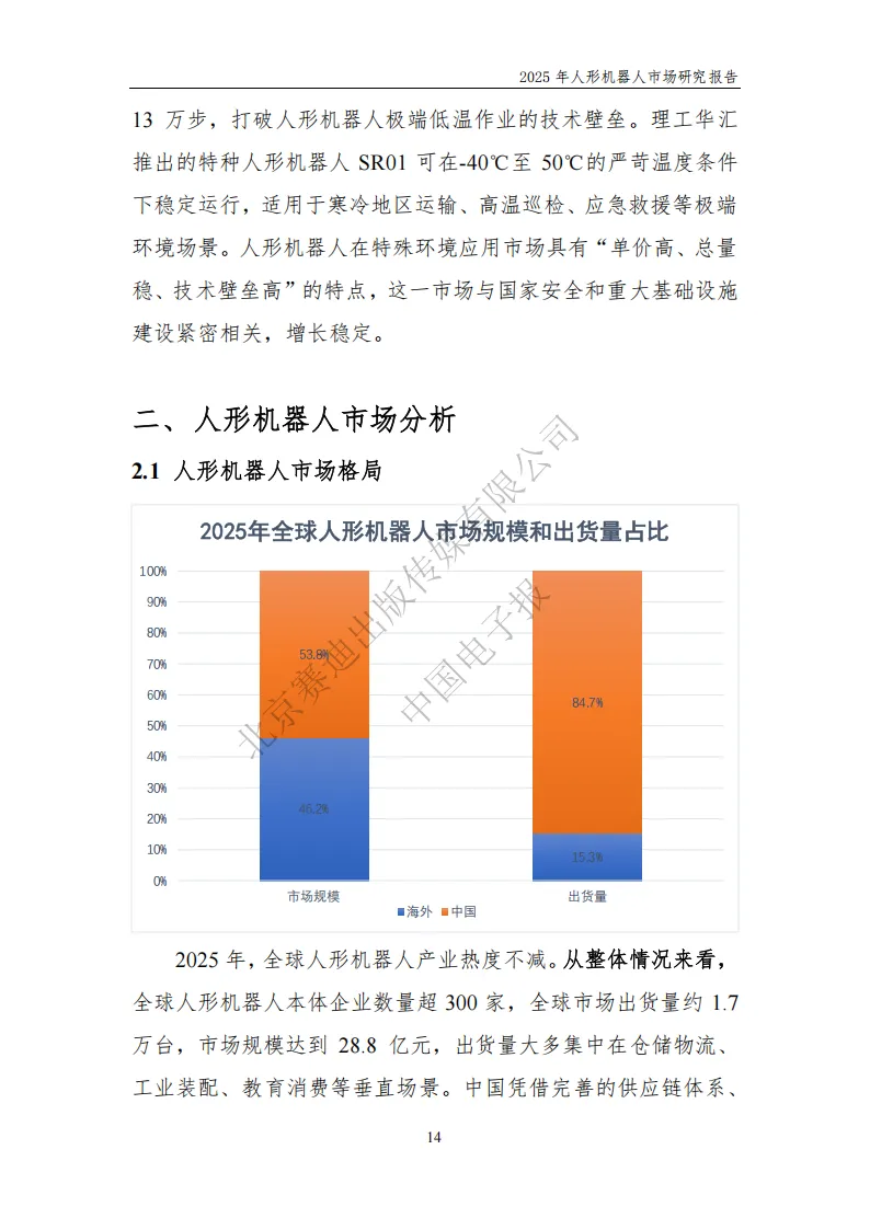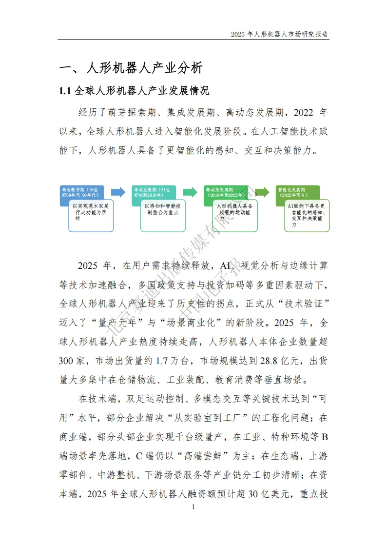 2025 年,人形机器人产业迎来历史性拐点,正式从 “技术验证” 迈入 “量产元年” 与 “场景商业化” 新阶段。据中国电子报发布的《2025 年人形机器人市场研究报告》显示,全球人形机器人本体企业超 300 家,出货量约 1.7 万台,市场规模达 28.8 亿元,工业制造、商业服务等垂直场景成为落地主力。