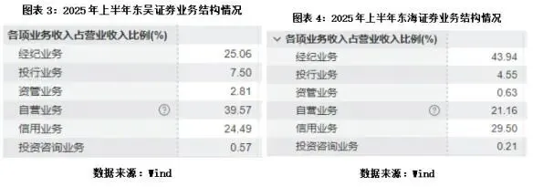 据Wind数据,2025年上半年,东吴证券的自营业务收入占比为39.57%,经纪及信用业务收入占比合计为49.55%,投行业务收入占比仅为7.5%;东海证券自营业务收入占比为21.16%,经纪及信用业务收入占比合计高达73.44%,投行业务收入占比仅为4.55%。