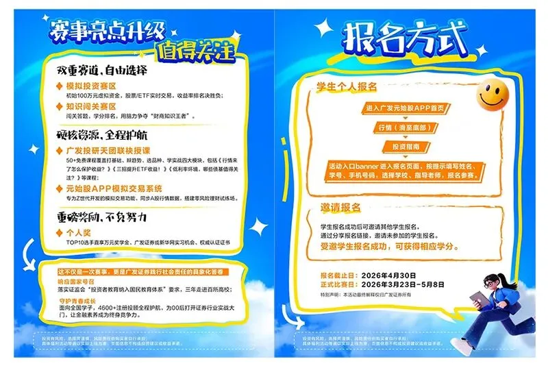 在2026年这个关键节点,面对复杂多变的国际国内经济形势,提升全民特别是年轻一代的金融素养,对于防范系统性金融风险、促进资本市场健康发展具有不可替代的作用。广发证券以“广发证券杯”为载体,为国家未来的经济栋梁“系好第一粒扣子”,只有为青年人梳理正确的投资观、风险观,中国的资本市场才能行稳致远。