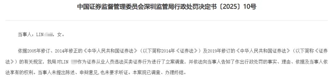2025年10月,深圳证监局发布处罚决定,对证券公司从业人员LIN某违法买卖证券行为进行行政处罚。