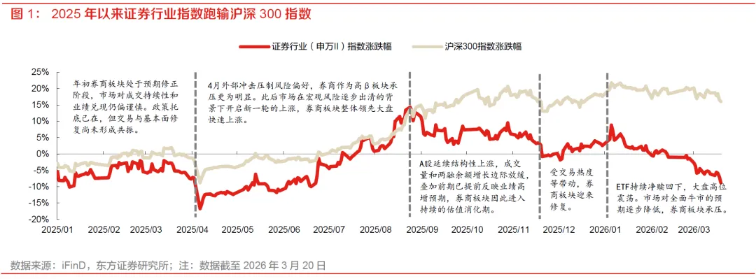 2025年初至3月底,板块处于预期修正期。市场在年初更关注成交持续性、业绩兑现节奏以及风险偏好能否真正修复,券商板块并未立即受益,反而持续跑输沪深300,政策托底尚未转化为交易端与基本面端的共振。