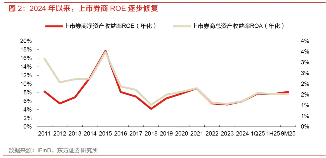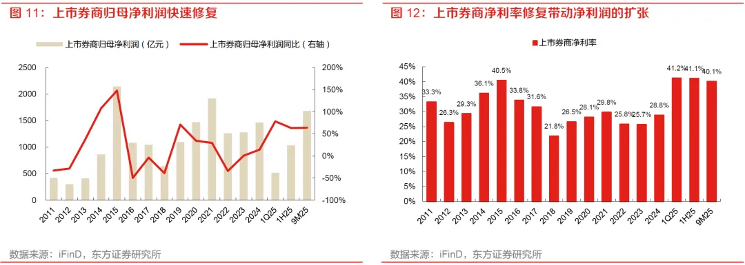 业绩层面,上市券商已进入收入温和修复、利润加速释放的阶段,有望为ROE提升构筑扎实根基。43家A股上市券商9M25实现营业收入4203亿元,同比增长12.9%;实现归母净利润1,686亿元,同比增长64.2%。利润弹性显著强于收入端,主要源于净利率修复。2024年行业净利率为28.8%,9M25升至40.1%,盈利质量持续提升,有望夯实ROE提升基础。