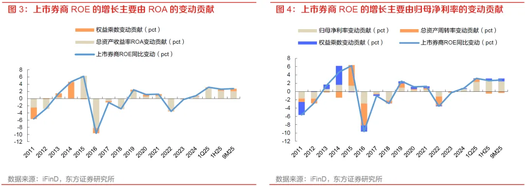 拆解上市券商ROE的增长,本轮ROE修复主要由ROA改善驱动,而ROA抬升又主要来自归母净利率修复。2024年/ 1Q25/ 1H25/ 9M25上市券商归母净利率分别为28.8%/ 41.2%/ 41.1%/ 40.1%,同比变动分别为+3.09 pct/ +13.74pct/ +14.17pct/ +12.53pct,对ROE的贡献分别为+0.62 pct/ +2.30 pct/ +2.65 pct/ +2.44 pct;相较之下,总资产周转率对ROE的拉动有限,1H25和9M25分别拖累ROE 0.51 pct和0.35 pct,权益乘数贡献则仅为0.46 pct和0.68 pct。整体看,当前券商基本面修复更多体现为利润率改善,而依赖杠杆扩张,在PB-ROE框架下,若后续成交活跃度和风险偏好再度企稳,板块仍具备由盈利修复向估值修复进一步传导的基础。