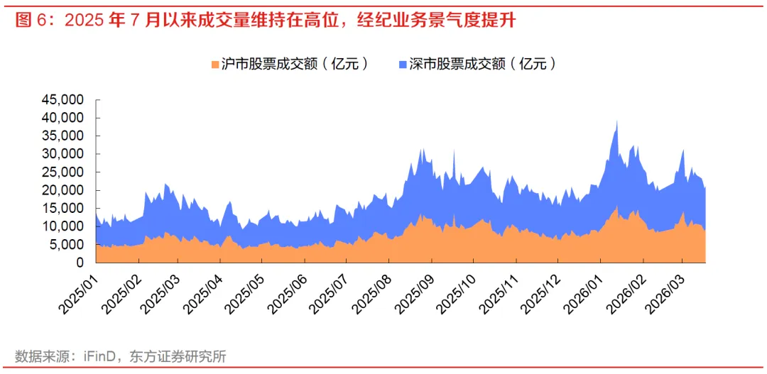 2025年7月以来,市场成交额中枢明显抬升,券商经纪业务景气度同步改善。沪深两市成交额自2025年7月起持续维持在相对高位,2025年8至9月及2026年1月前后均出现阶段性放量,市场交投活跃度较上半年明显提升。对于券商而言,成交额上行直接带动代理买卖、财富管理及资本中介等条线景气度改善,也是板块基本面修复较为直接和领先的高频验证指标,表征市场成交中枢的抬升和经纪业务景气度的持续改善。